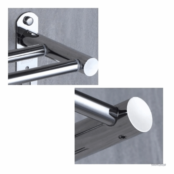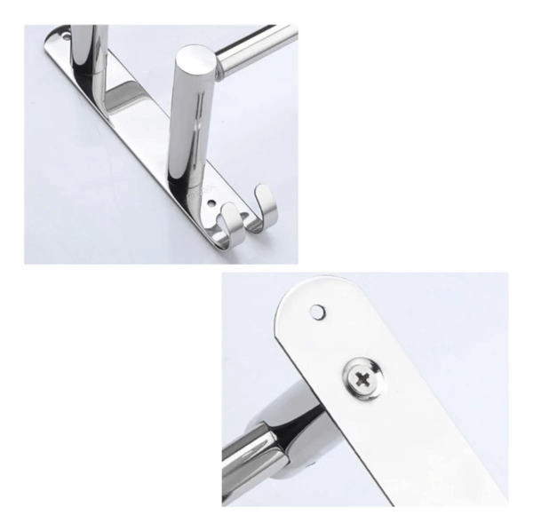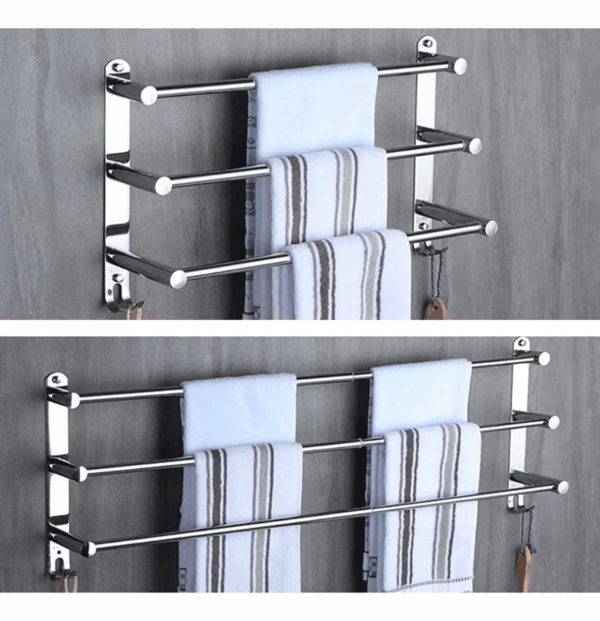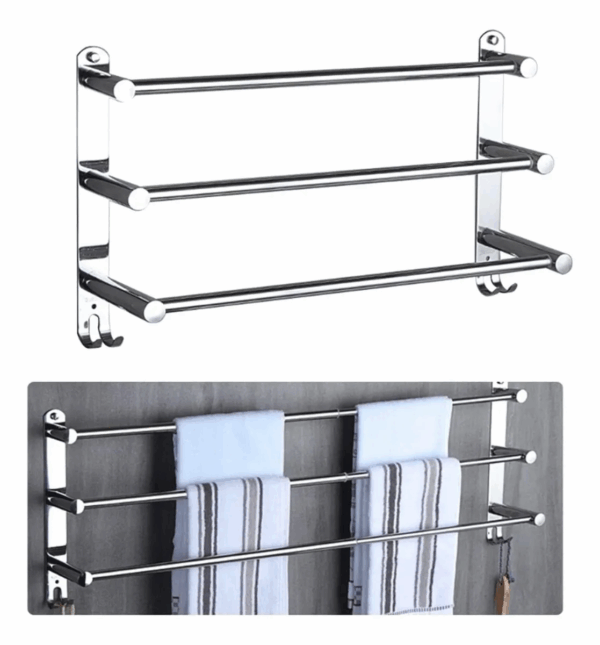 Toallero de pared multifuncional de acero inoxidable con 3 barras y ganchos, ideal para baño, cocina o lavandería. Organiza toallas y accesorios con estilo moderno, resistente y fácil de instalar.